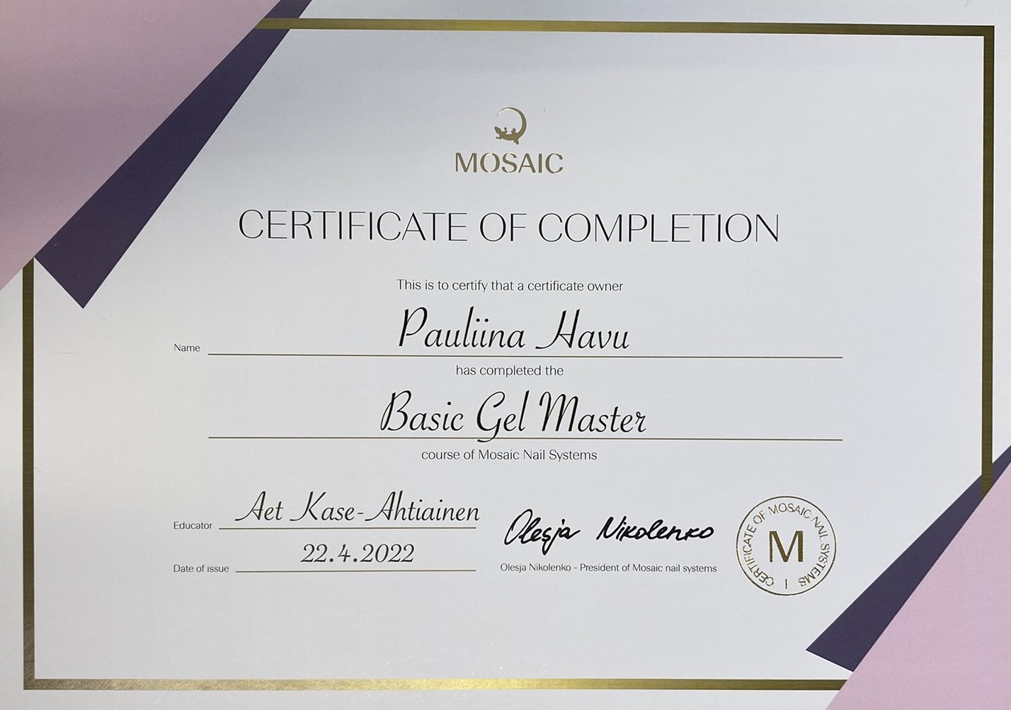 Olen käynyt Shellacin kynsikoulutuksen (2020), Mosaicin basic gel master peruskoulutuksen (2022) sekä Celina Rydenin online nail artist part 1 koulutuksen (2022). Rakennekynsissä käytän muottitekniikkaa ja kynnet tehdään rakennegeelillä. Käytän kynsiä tehdessä laadukkaita vain ammattikäyttöön tarkoitettuja Mosaicin ja The GelBottlen geelituotteita, laitteita sekä materiaaleja. Kynsien tekeminen on jatkuvaa opettelua ja haluankin kouluttautua vielä lisää tulevaisuudessa erilaisten koulutusten avulla. Tärkeintä itselleni tässä työssä on työskennellä turvallisesti, hygieenisesti ja asiakkaan kynsiä kunnioittaen sekä tehdä tarkkaa jälkeä ja palvella asiakkaita mahdollisimman hyvin. Harjoittelen ahkerasti erilaisten koristeluiden tekemistä, joten kysy rohkeasti erilaisista vaihtoehdoista.