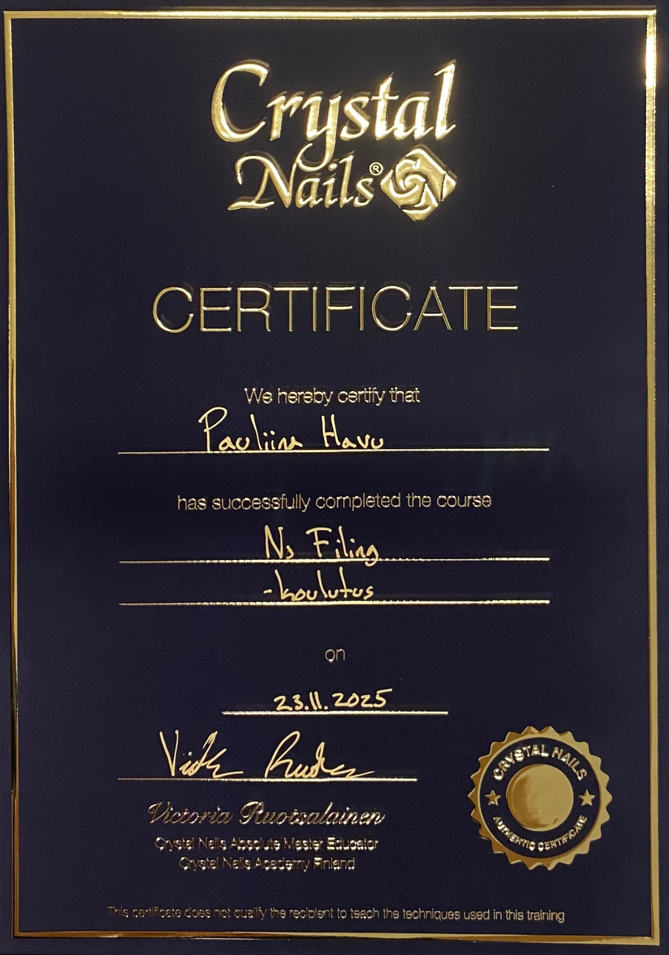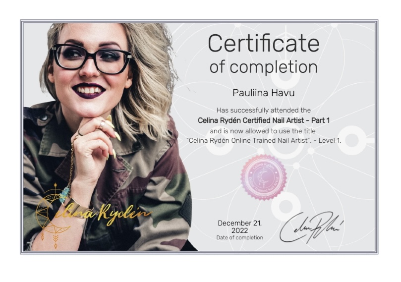 Olen käynyt Shellacin kynsikoulutuksen (2020), Mosaicin basic gel master peruskoulutuksen (2022) sekä Celina Rydenin online nail artist part 1 koulutuksen (2022). Viimeisimpänä olen käynyt Victoria Ruotsalaisen pitämän No filing rakennekynsikoulutuksen (2025). Rakennekynsissä käytän muottitekniikkaa ja kynnet tehdään rakennegeelillä. Käytän kynsiä tehdessä laadukkaita vain ammattikäyttöön tarkoitettuja Mosaicin ja The GelBottlen geelituotteita, laitteita sekä materiaaleja. Kynsien tekeminen on jatkuvaa opettelua ja haluankin kouluttautua vielä lisää tulevaisuudessa erilaisten koulutusten avulla. Tärkeintä itselleni tässä työssä on työskennellä turvallisesti, hygieenisesti ja asiakkaan kynsiä kunnioittaen sekä tehdä tarkkaa jälkeä ja palvella asiakkaita mahdollisimman hyvin. Harjoittelen ahkerasti erilaisten koristeluiden tekemistä, joten kysy rohkeasti erilaisista vaihtoehdoista.
